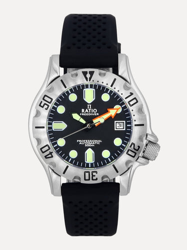 Introducing the Ratio Freediver Professional Sapphire Black Dial Automatic RTF009 500M Men's Watch, a timepiece that perfectly blends style and function. The black dial adds a pop of color to the classic design, making it the perfect accessory for any adventure.