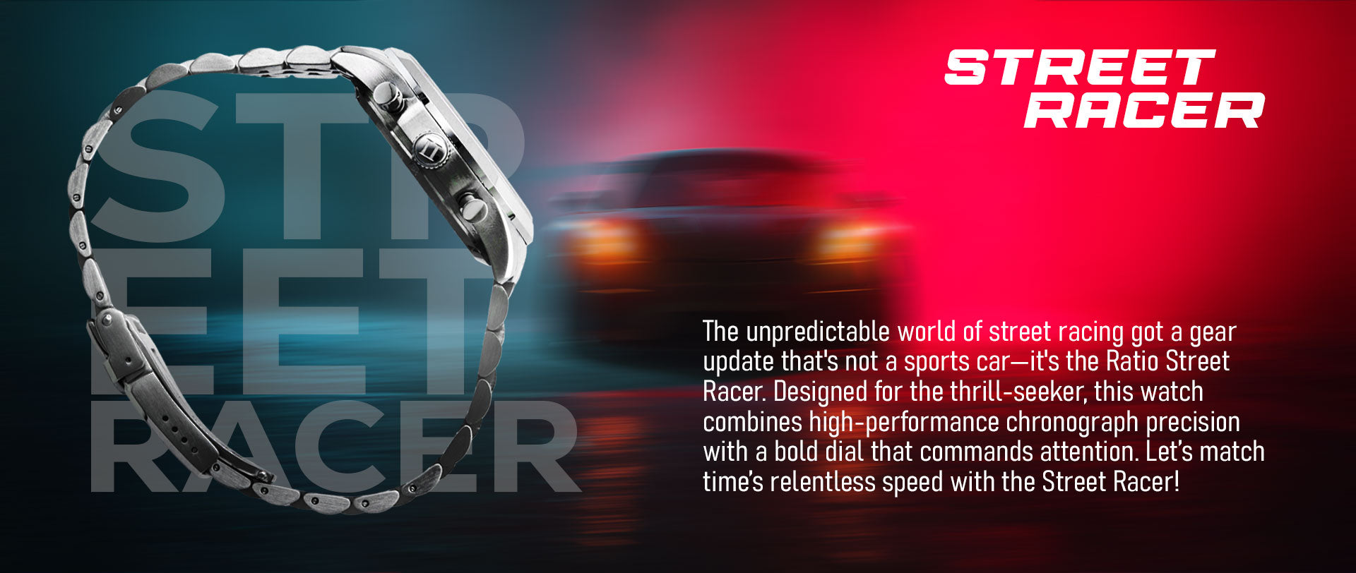 • Caseback: Solid embossed caseback with engraved image of City skyline and Race car running through the streets.
